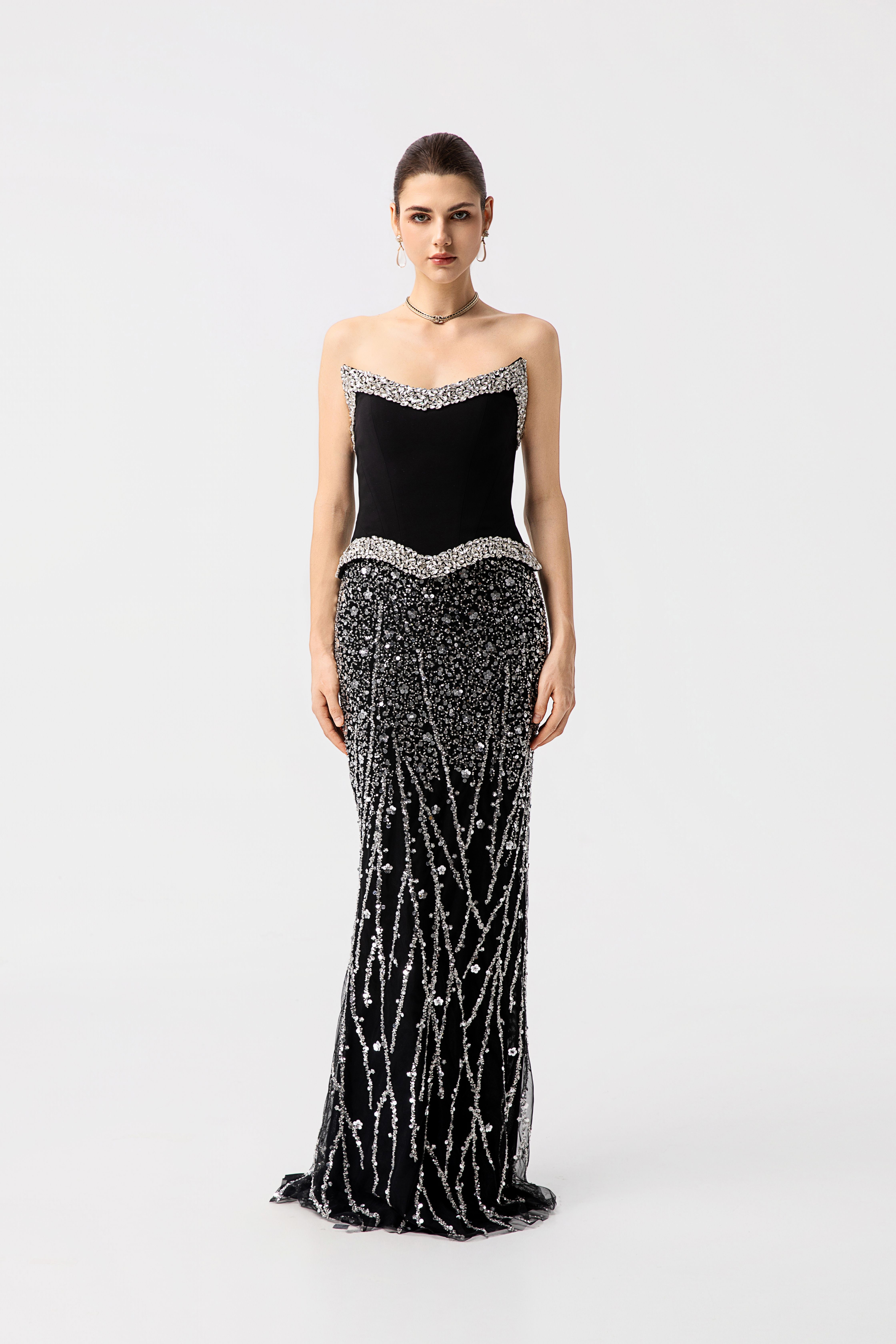 采用流畅的黑色上身和渐变水晶装饰,将经典极简主义与华丽细节完美融合。美人鱼轮廓突出女性曲线,而银色珠饰则仿效“夜晚的星光”。这款作品专为追求优雅与个性的现代女性设计,重新定义了正式服装的魅力。