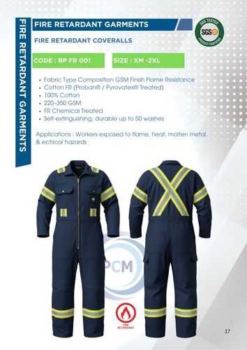 Fabric Type Composition GSM Finish Flame Resistance Cotton FR (Proban® / Pyrovatex® Treated) 100% Cotton 220–350 GSM FR Chemical Treated Self-extinguishing, durable up to 50 washes Applications : Wo ...