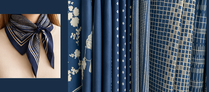 legant, refined, and effortlessly timeless, the Midnight Indigo Collection brings together our signature florals, geometric grids, and dotted borders in deep navy and soft ivory. Crafted in sumptuous silk, each scarf drapes with sophistication — from structured knots to fluid folds. This palette embodies quiet luxury, celebrating the harmony of heritage craftsmanship and contemporary design.
